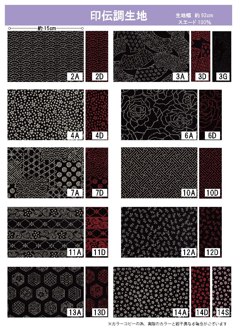 一越ちりめん色見本 | メッシュ生地の柄見本 | ジャカード生地の柄見本 | 印伝調生地の柄見本 | Waxed cord ワックス・コード ※こちら以外のサイズもあります |