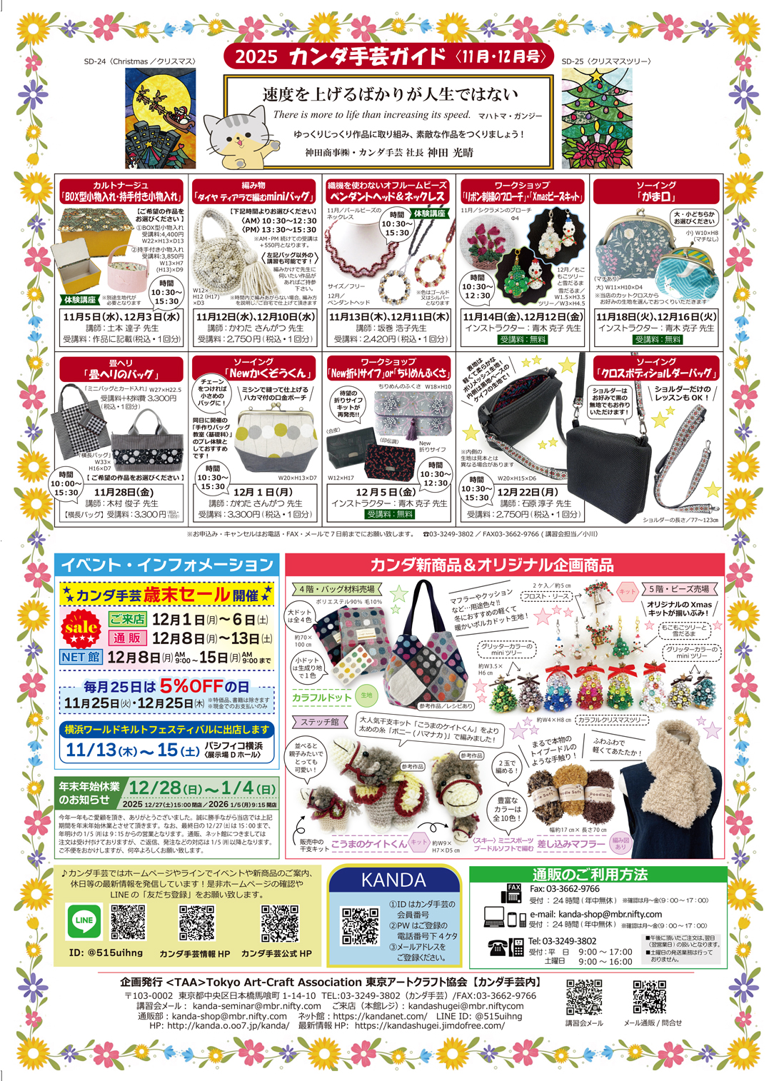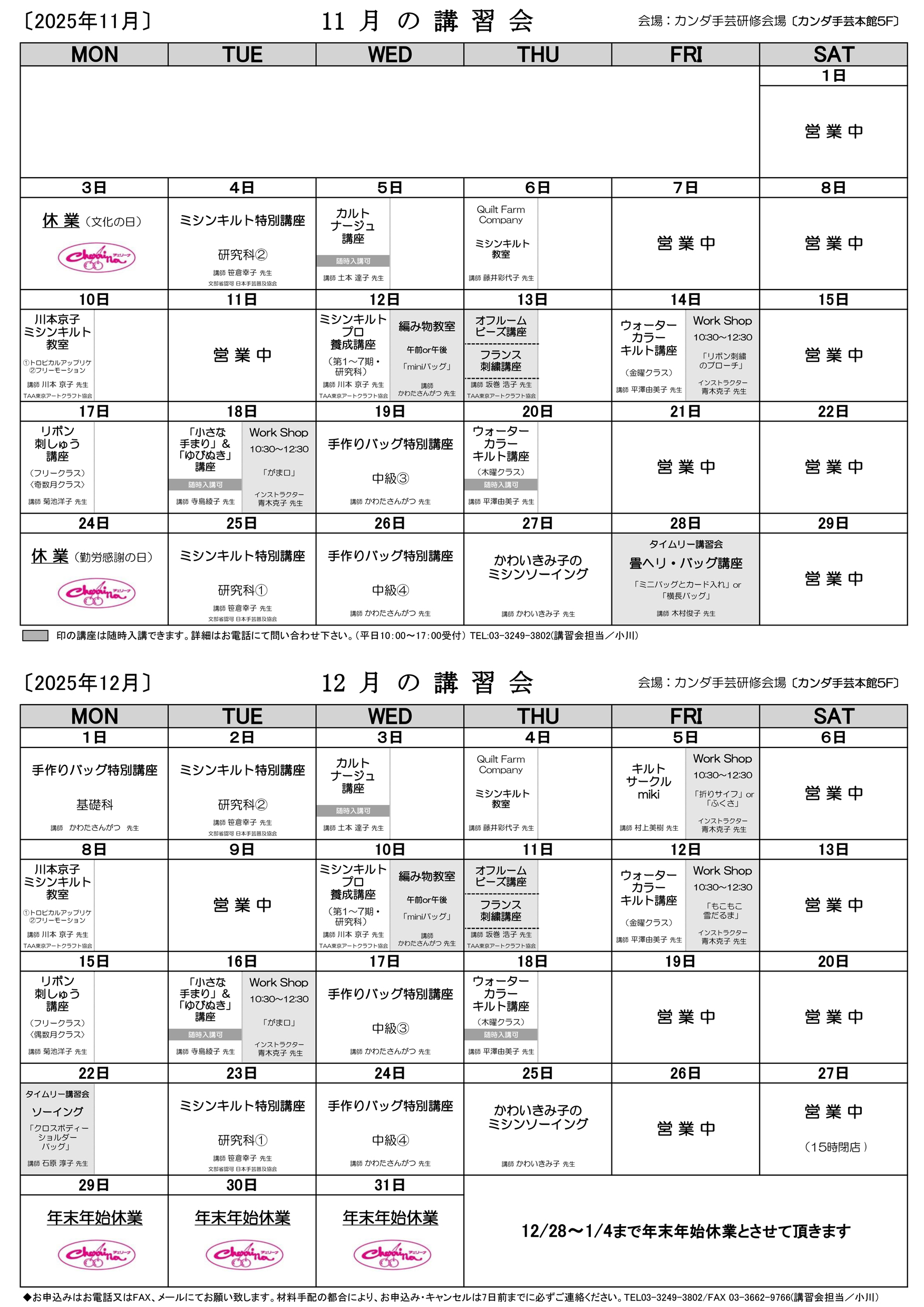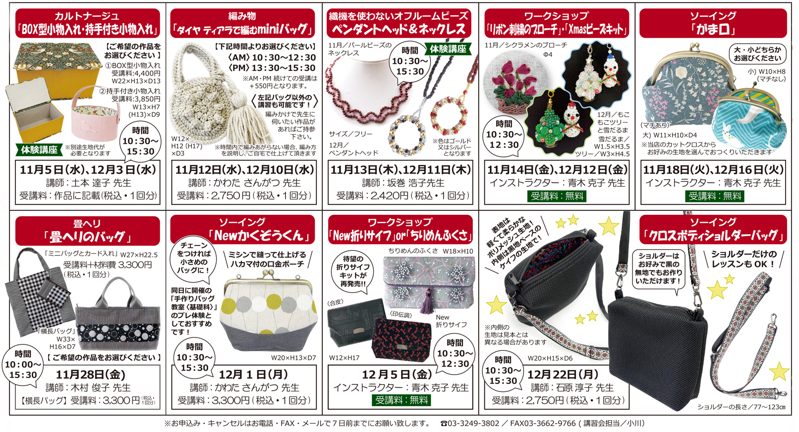 | 開講中の講座 ★手作りバッグ特別講座:かわたさんがつ先生 10:30〜3:30※基礎講座 <随時入講可>